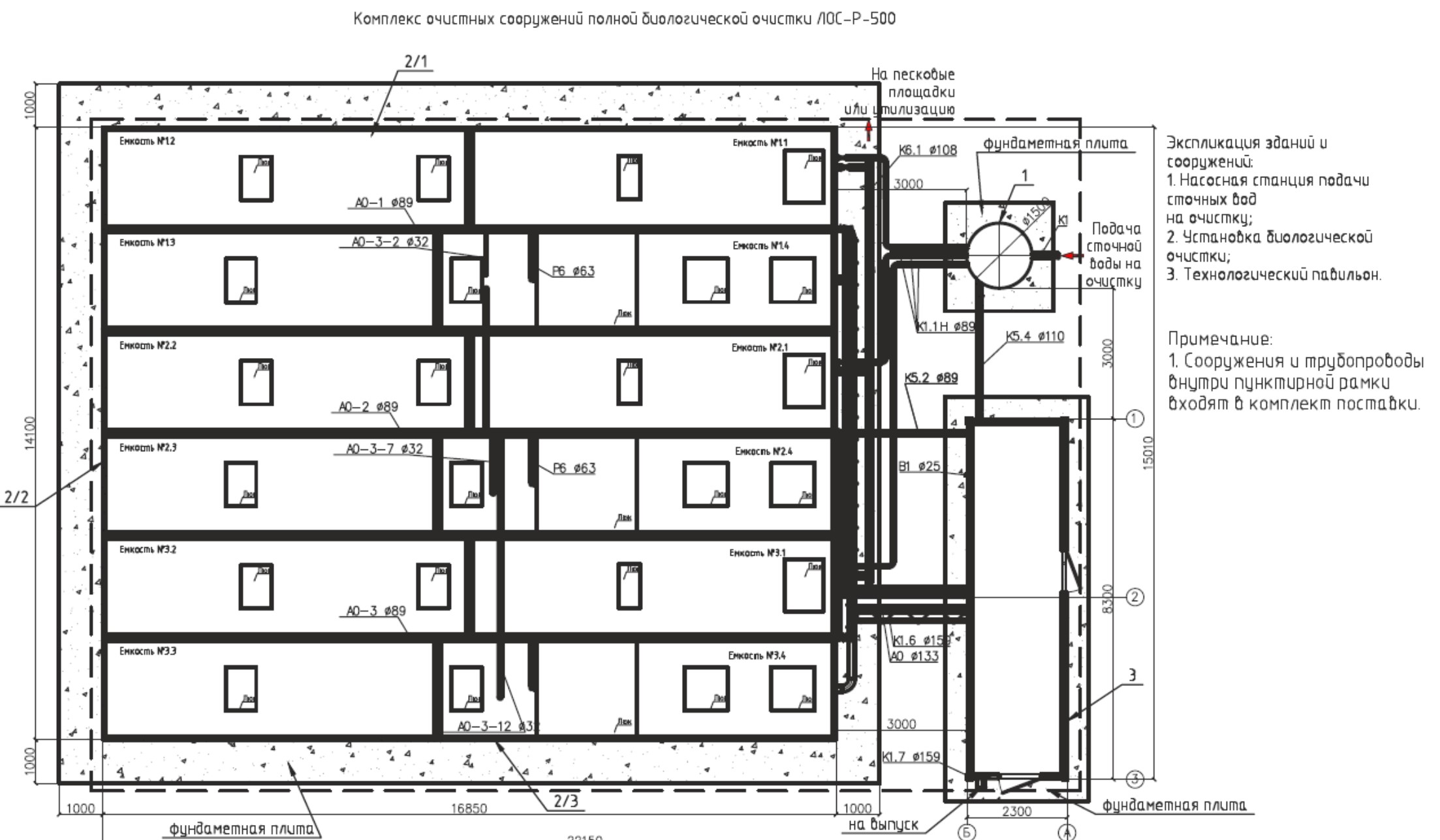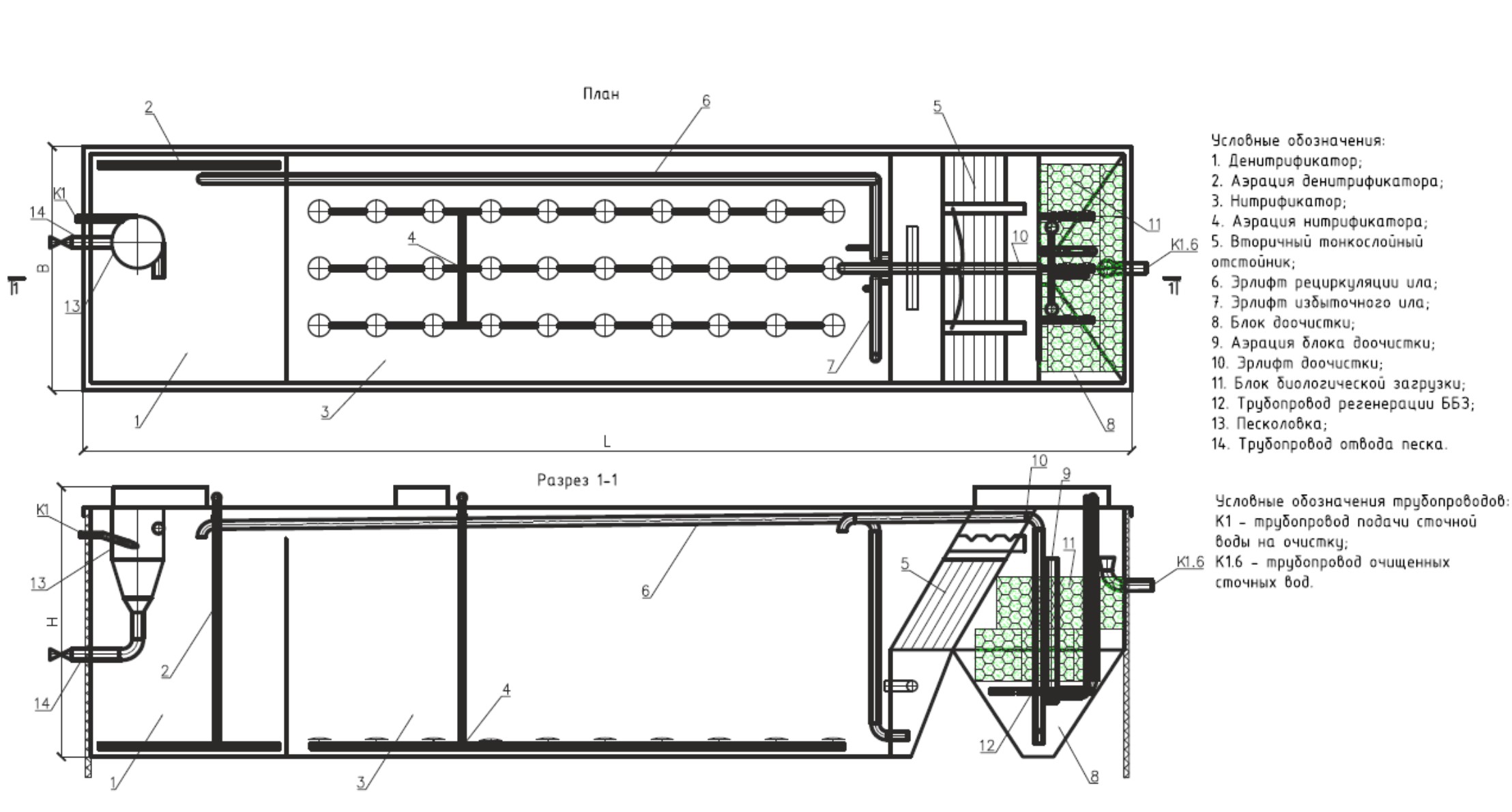 Песчаная пульпа из песколовки отводится на песковые площадки. Сточные воды из песколовки поступают на установку полной биологической очистки (поз. 2), которая состоит из биореактора-нитрификатора (аэротенка) вторичного отстойника и блока доочистки.